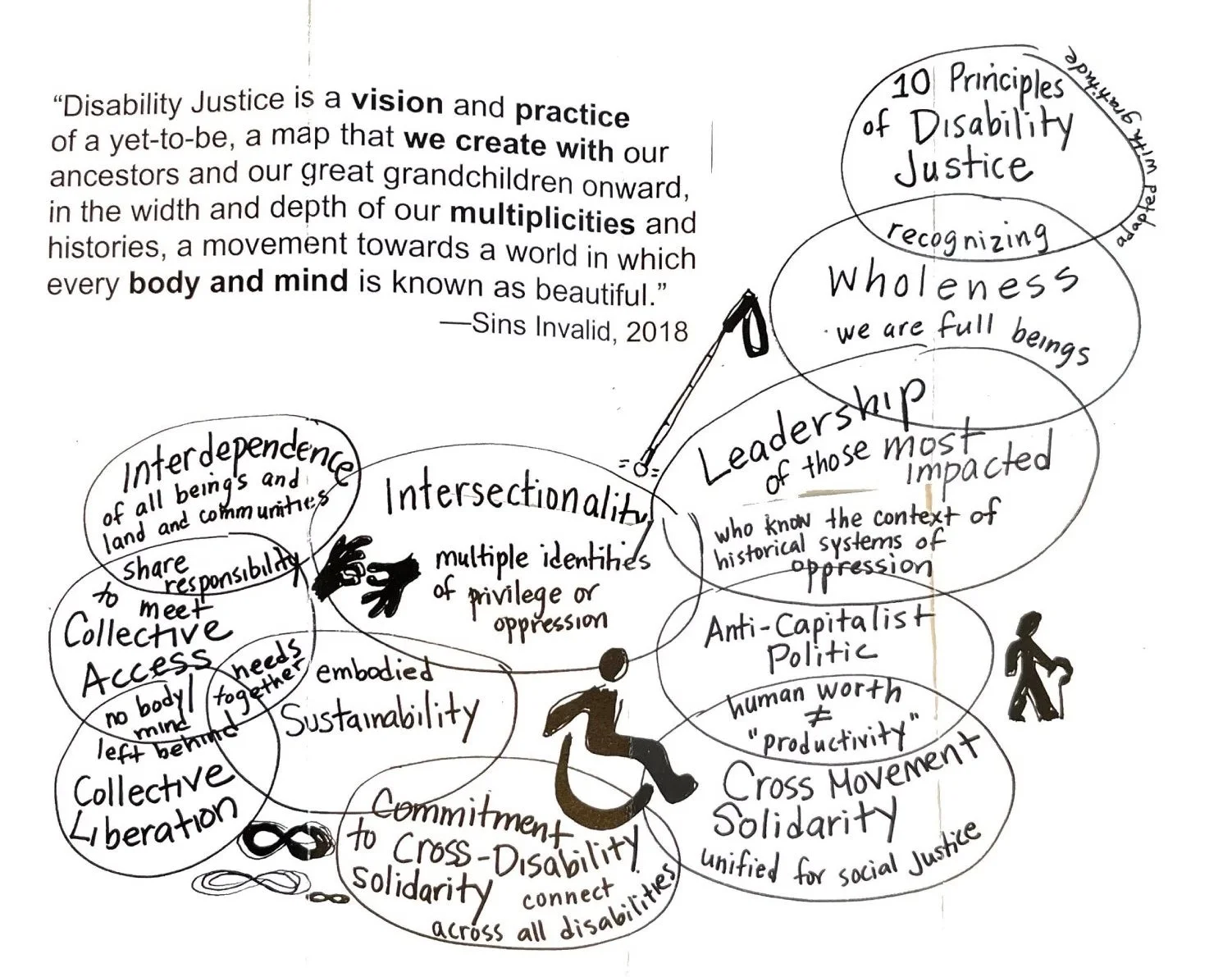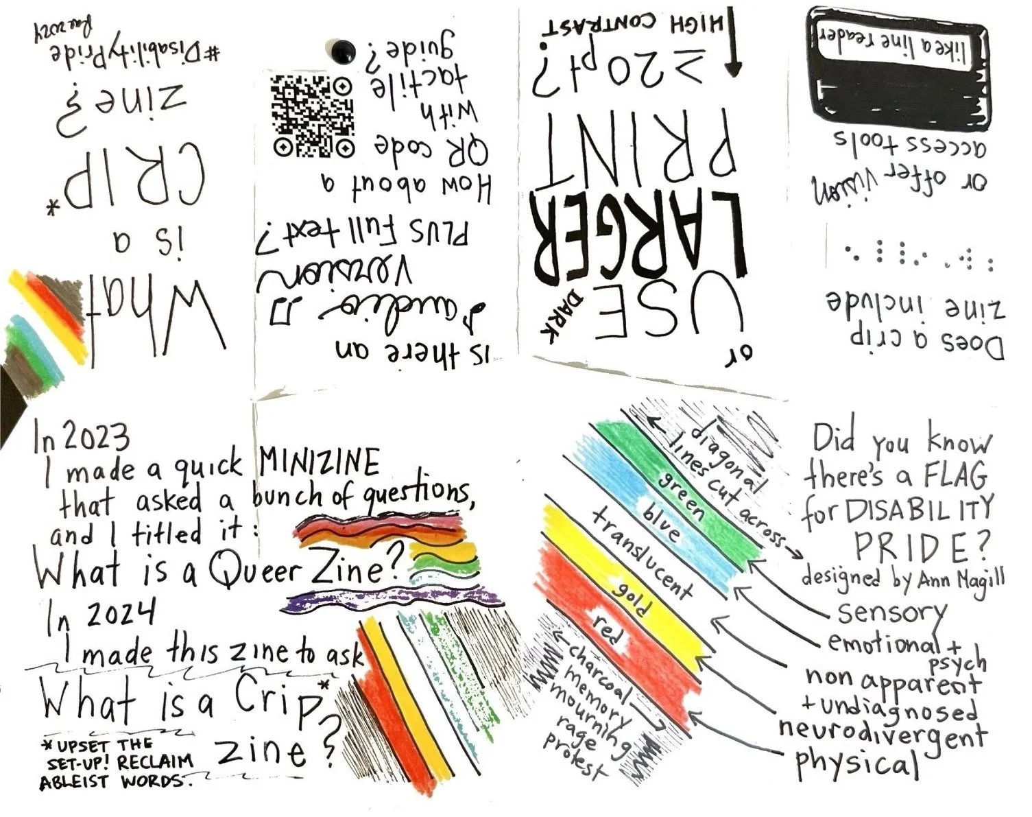 I made this double-sided tiny comic for Disability Pride Month July 2024. With tactile as well as visual surprises, bonus material on the interior, and featuring Principles of Disability Justice and the Disability Pride flag, the zine unfolds from a single sheet and asks, “What is a crip zine?” Listen to the audio on this page. Link to full text of the audio here.
